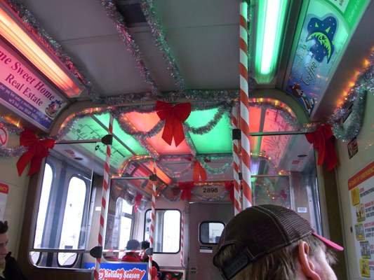この時期のシカゴは霧がかっていてどんよりしたかんじでした.町は早くもクリスマスモード.駅構内はクリスマスツリーなどで装飾され奇麗でした.クリスマスカラーに装飾された電車も走っていました.運よくその電車にも乗ることができました.車内では杖の形をしたキャンディを無料で配布していました.